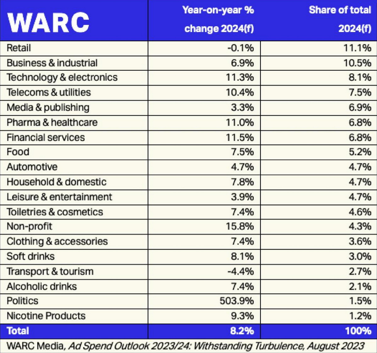 Ожидаемый рост расходов на рекламу в 2024 году составит 8,2%. Наибольший рост в следующем году аналитики ждут от сектора финансовых услуг (+11,5%), за ними следуют технологии и электроника (+11,3%) и фармацевтика и здравоохранение (+11,0%). Эти секторы, как правило, являются фаворитами телевидения.