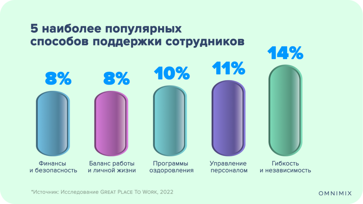 Исследование Great Place To Work показало, что за последние 2 года здоровье и благополучие сотрудников стало одним из важнейших HR-приоритетов и выделило 5 наиболее популярных способов поддержки сотрудников: