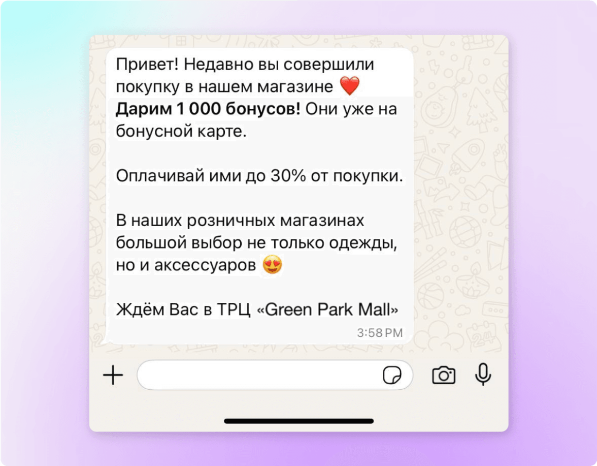 Отправлять персонализированные сообщения в WhatsApp*, автоматически подставляя в текст данные клиента (например, имя, статус заказа или бонусный баланс);