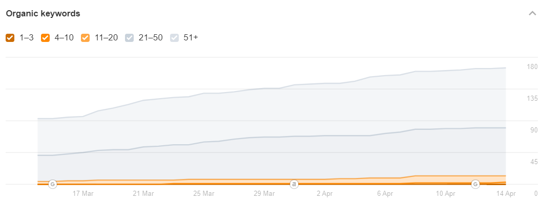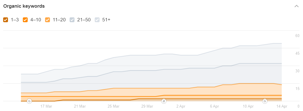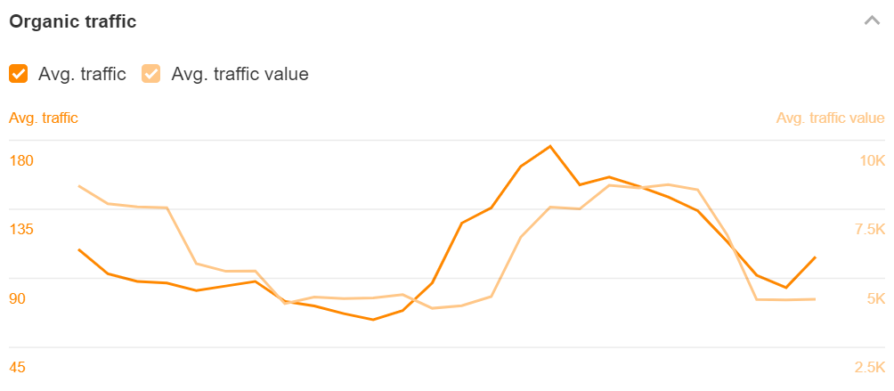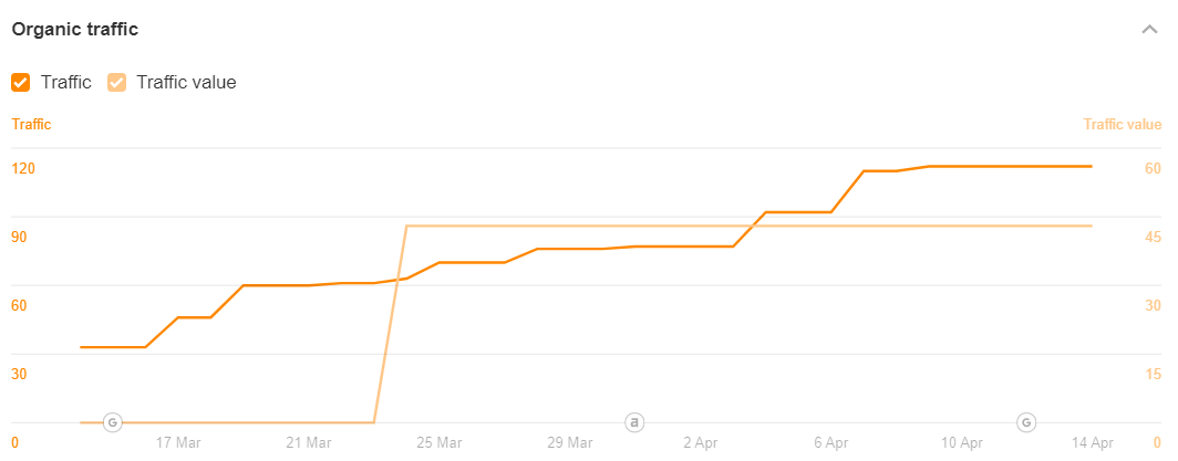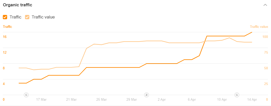 У второй страницы показатели видимости выросли почти вдвое, начал увеличиваться и трафик: