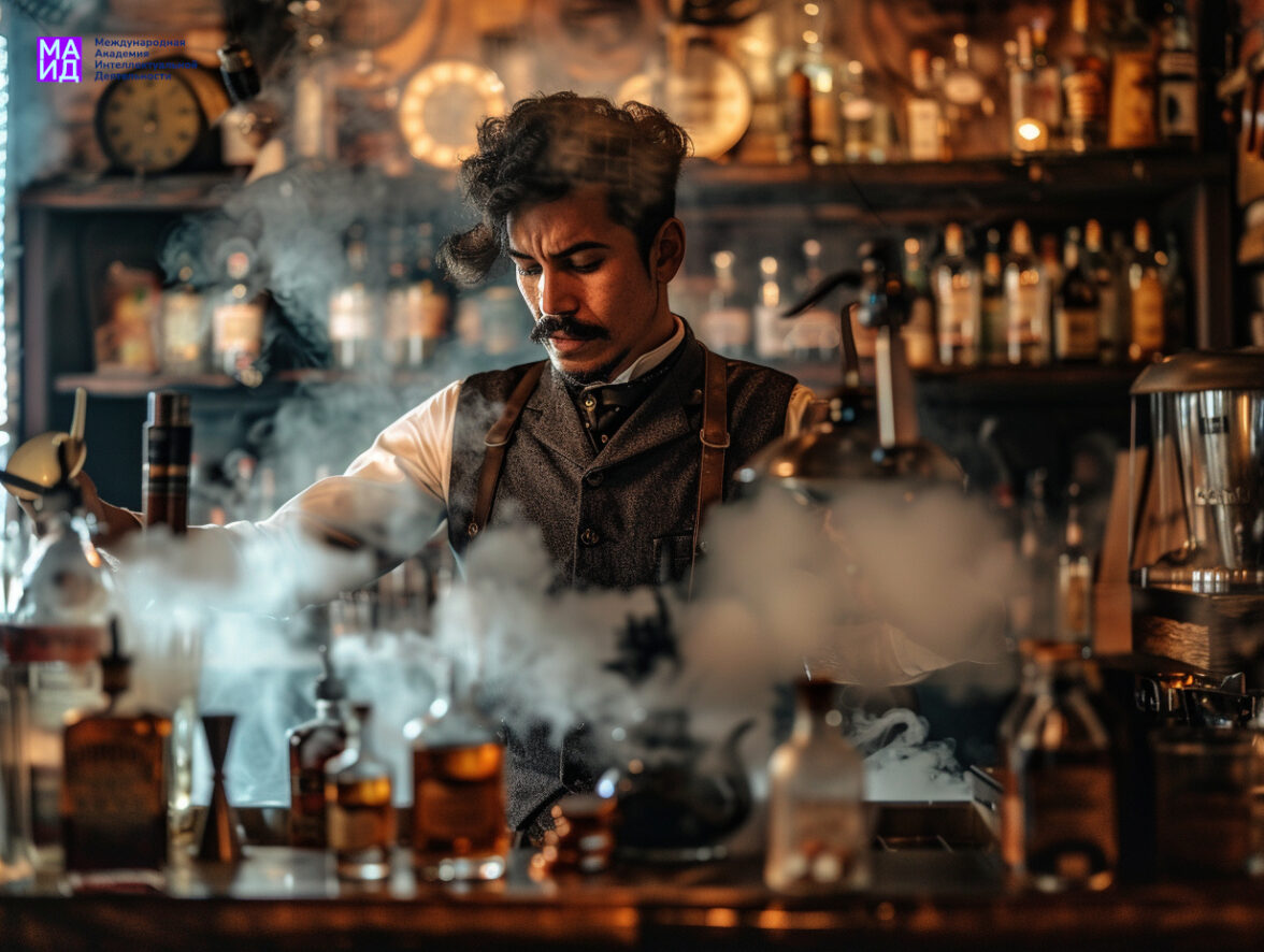Промпт: Steampunk bar and steaming cocktail professional photography, back lighting, winner photo awards, Using a Fujifilm X-T4 and a 56mm f/1.2 lens, top front —v 6.0 —style raw —ar 4:3.