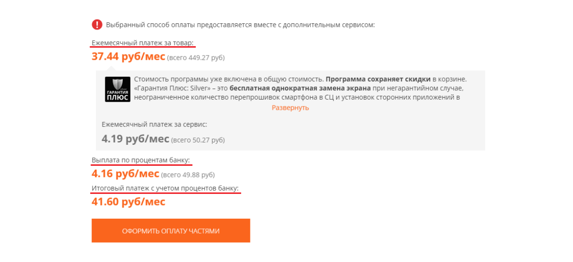 Суть работ. Мы провели работу по улучшению отображения информации как в карточке товара, так и на этапе оформления заказа. Задача состояла в том, чтобы сделать расчеты максимально прозрачными, чтобы клиент мог понять, как формируется цена. Например, при оформлении кредита теперь отображаются ежемесячные платежи в пользу магазина и отдельно — процент банка, что у других магазинов часто скрыто.