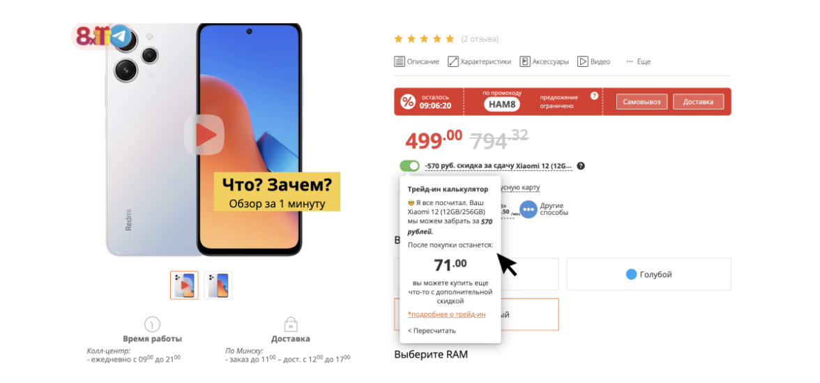 Суть работ. Мы разработали страницу «Трейд-ин», где клиенты могут легко сдать старое устройство и получить значительную скидку на покупку нового. Особенность в том, что прямо на странице товара можно быстро рассчитать скидку и увидеть окончательную цену на новый товар. Также добавлена функция «выкупа», позволяющая сдать старый телефон и просто получить деньги.
