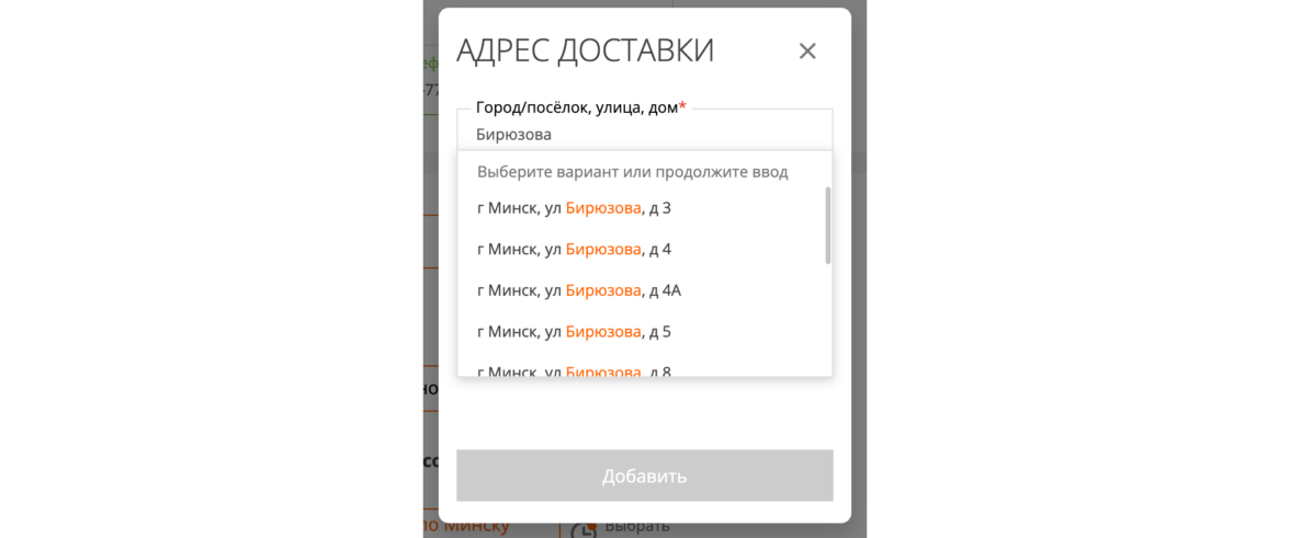 Процесс выглядит следующим образом: пользователь вводит адрес, система сверяется с базой данных DaData и предлагает варианты только из реально существующих адресов, исключая ошибки.