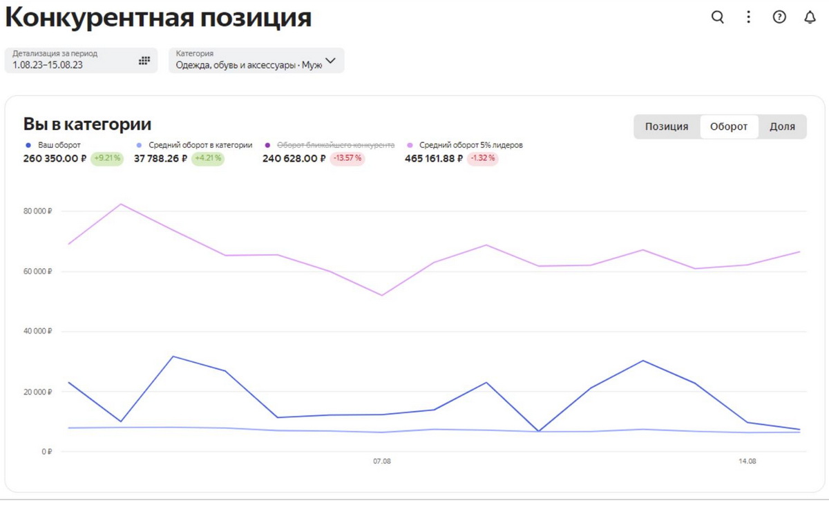 «Оборот». Сравнение оборота магазина по сделанным заказам с оборотом ближайшего конкурента, средним в категории и средним среди 5% продавцов-лидеров;