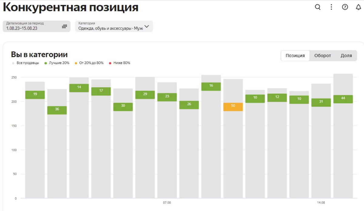 «Позиция». Отображение положения магазина относительно конкурентов и общее количество продавцов в категории. Это показатель считается по обороту всех созданных на маркетплейсе заказов;