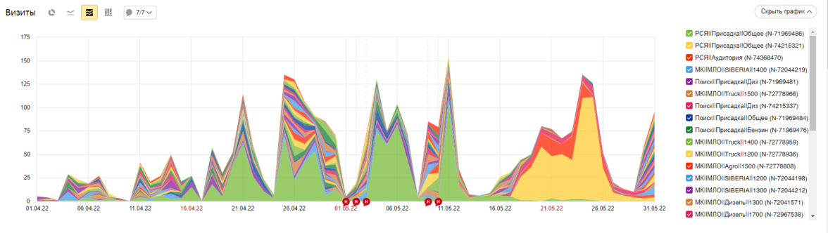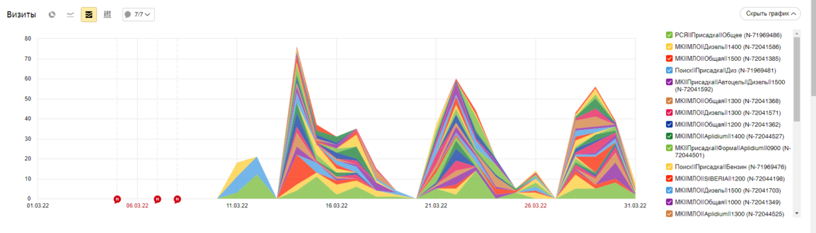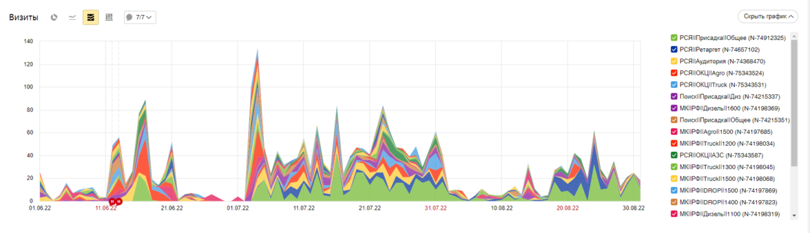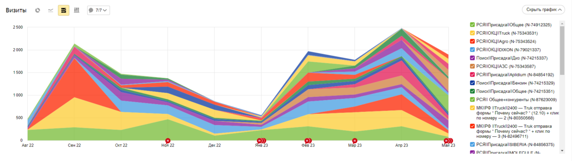 Замеры проводились с 08.2022 по 07.2023.До 02.2023 со всеми кампаниями мы шли вровень по количеству трафика. Это логично. Количество запросов на наши продукты идет равномерно плюс минус с учетом сезонности на некоторые продукты (зимой в ДТ, осенью продукты с увеличением смазывающих свойств).