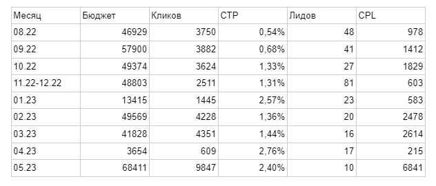 В Яндекс изменился алгоритм работы Мастеров кампаний. (конец 2022-начало 2023 года). Разогнать их при тех же настройках на постоянный стабильный поток лидов было уже нельзя. Мы понимали это не только на кейсе Одуванчика, но и на кейсе детской онлайн-школы, где объем лидогенерации был от 200 до 1500 в месяц.