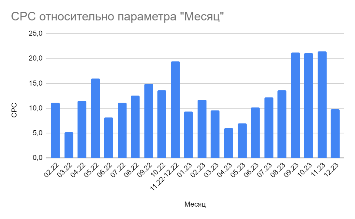 А внешний фактор — это рост конкуренции по нашей тематике конкретно. В первом шаге (аналитике) я привела пример компаний, которые раньше не запускали трафик, а к середине и концу 2023 года значительно увеличили инвестиции в рекламу.