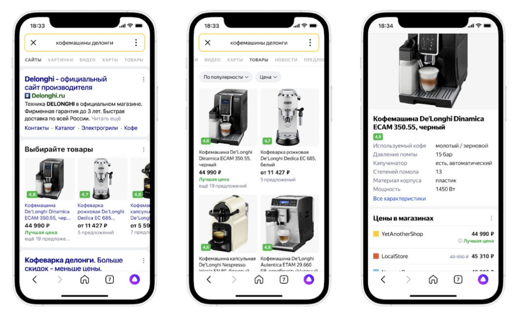 С помощью инструмента пользователи могут сравнить цены на товар в разных интернет-магазинах прямо в поисковой выдаче или в разделе «Товары», не переходя на сайт продавца. Также в поиске по товарам отображаются предложения со скидками и продукты с отметкой «Лучшая цена» — то есть, самое выгодное предложение среди онлайн-магазинов, которое нашли алгоритмы Яндекса.