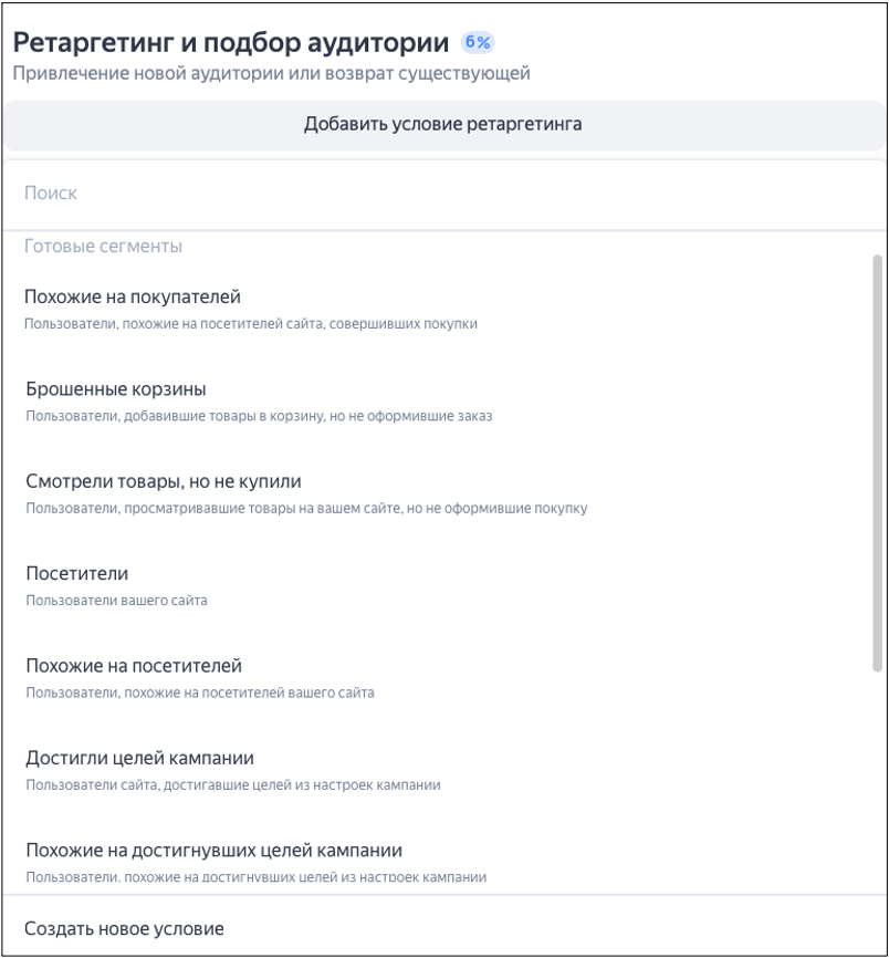 При этом хотим отметить, что для корректной работы с готовыми сегментами очень важно определиться с целью. Например, интернет-магазин может использовать не только конверсионные аудитории «Достигли целей кампании», но и протестировать готовые сегменты на микроцели — «Брошенные корзины», «Смотрели товар, но не купили». Это позволит увеличить охваты рекламной кампании, а также вернуть пользователей, которые еще не купили товар, но потенциально заинтересованы.