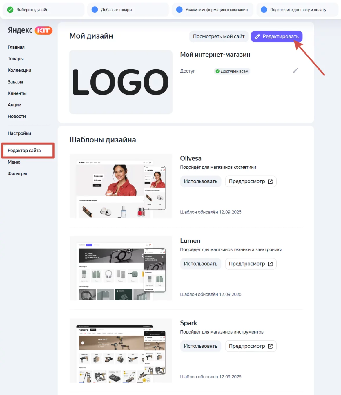 В этом разделе можно изменить внешний вид магазина, подключить новый шаблон или настроить текущий. Для редактирования нажмите «Редактировать» в блоке «Мой дизайн».