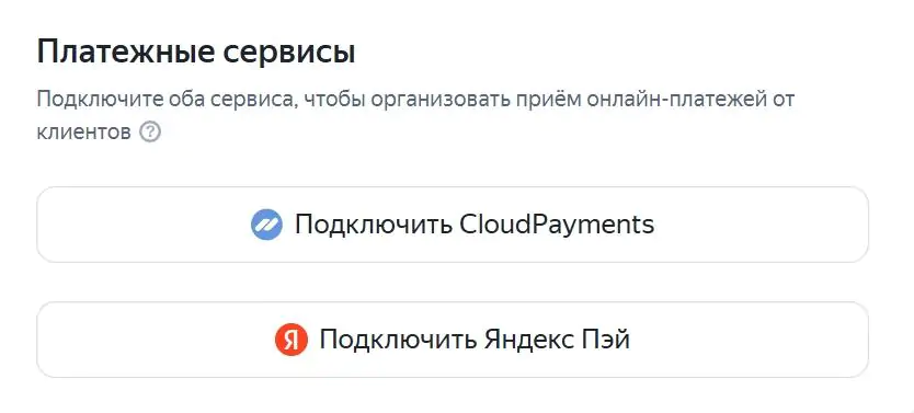 Пока доступны два варианта — CloudPayments и Яндекс Пэй. Лучше подключить оба, чтобы у пользователей было больше выбора для оплаты. Нажмите «Подключить», а затем следуйте инструкциям.