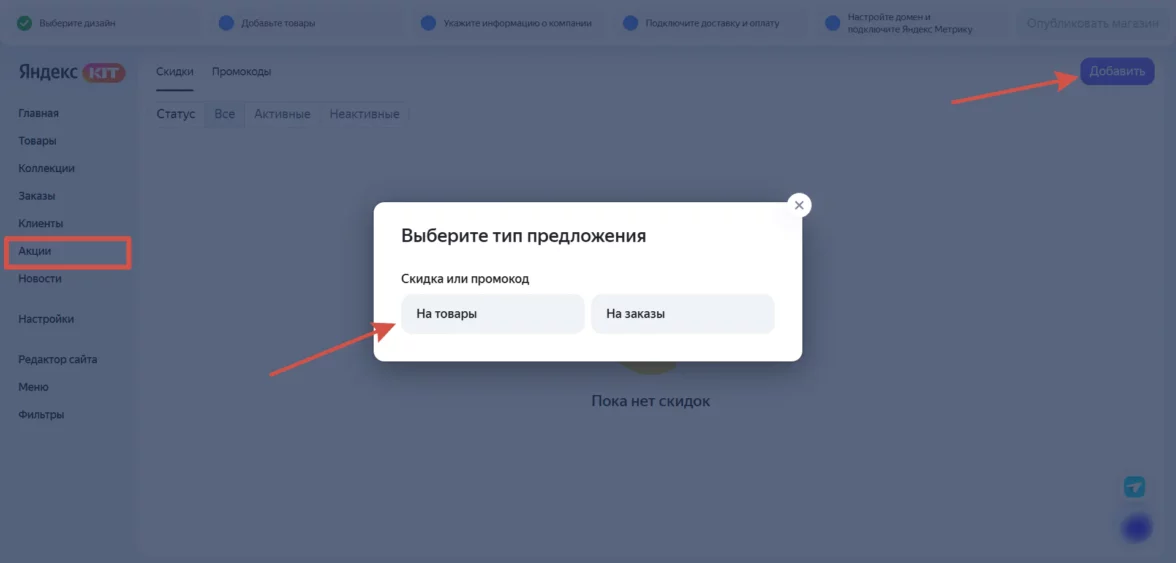 В разделе «Акции» можно создавать новые и управлять уже действующими скидками и промокодами. Чтобы добавить предложение, перейдите во вкладку «Скидки» или «Промокоды» и нажмите «Добавить». Затем выберите тип акции — «На товары» или «На заказы».