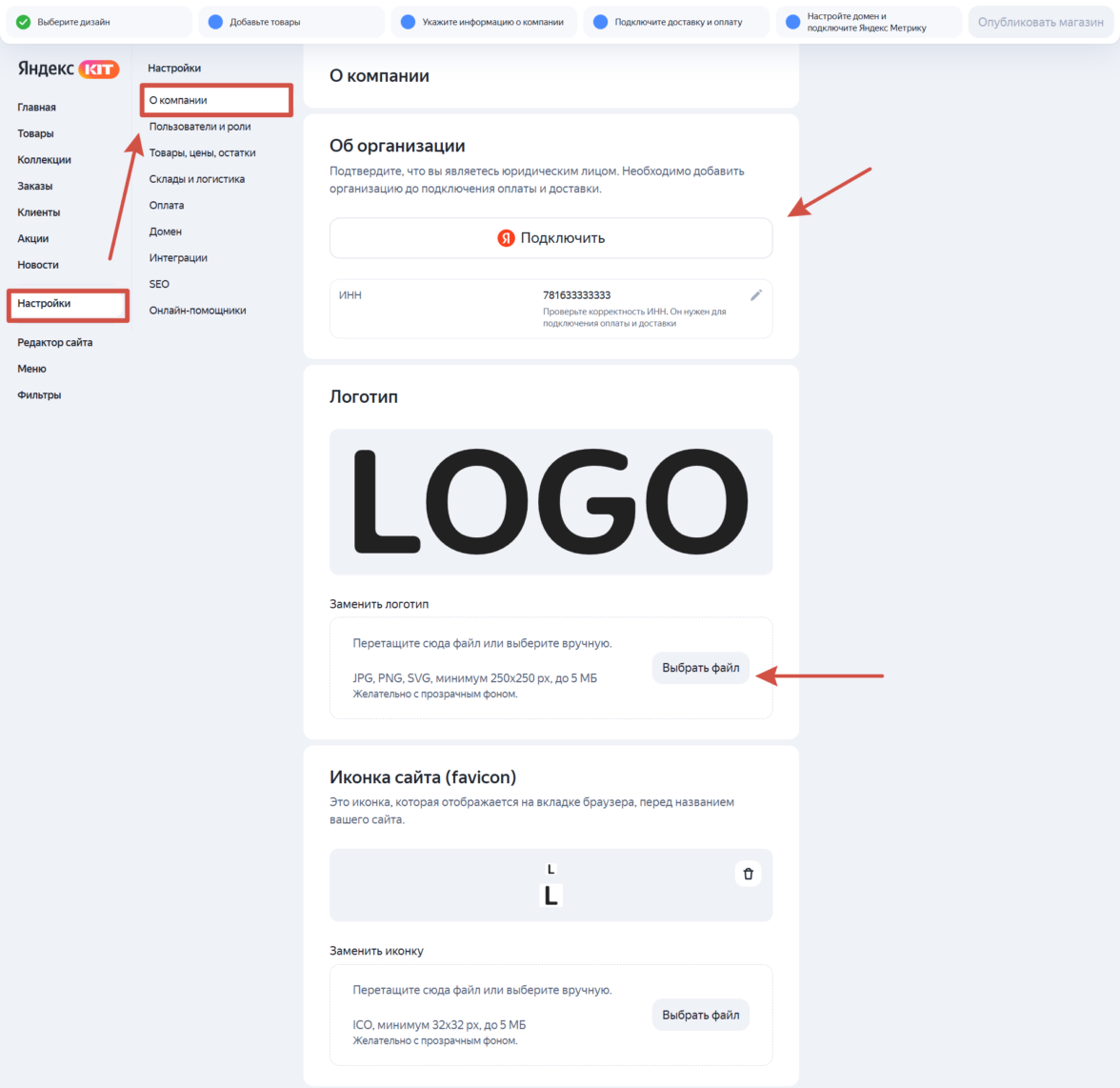 Во вкладке «О компании» можно подключить Яндекс Бизнес для автоматической загрузки информации о компании — это рекомендуется сделать до настройки оплаты и доставки. Здесь также можно поменять логотип и фавикон, обновить контактные данные магазина и добавить ссылки на соцсети и мессенджеры.