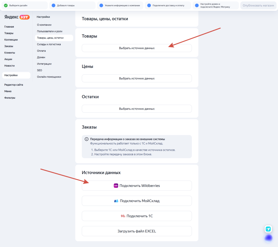 Следующий шаг — добавить ассортимент магазина. Настройте интеграцию с Wildberries, 1С, «Мой Склад» или загрузите данные из файла Excel. После этого в блоках «Товары», «Цены» и «Остатки» нажмите «Выбрать источник данных» для синхронизации информации.