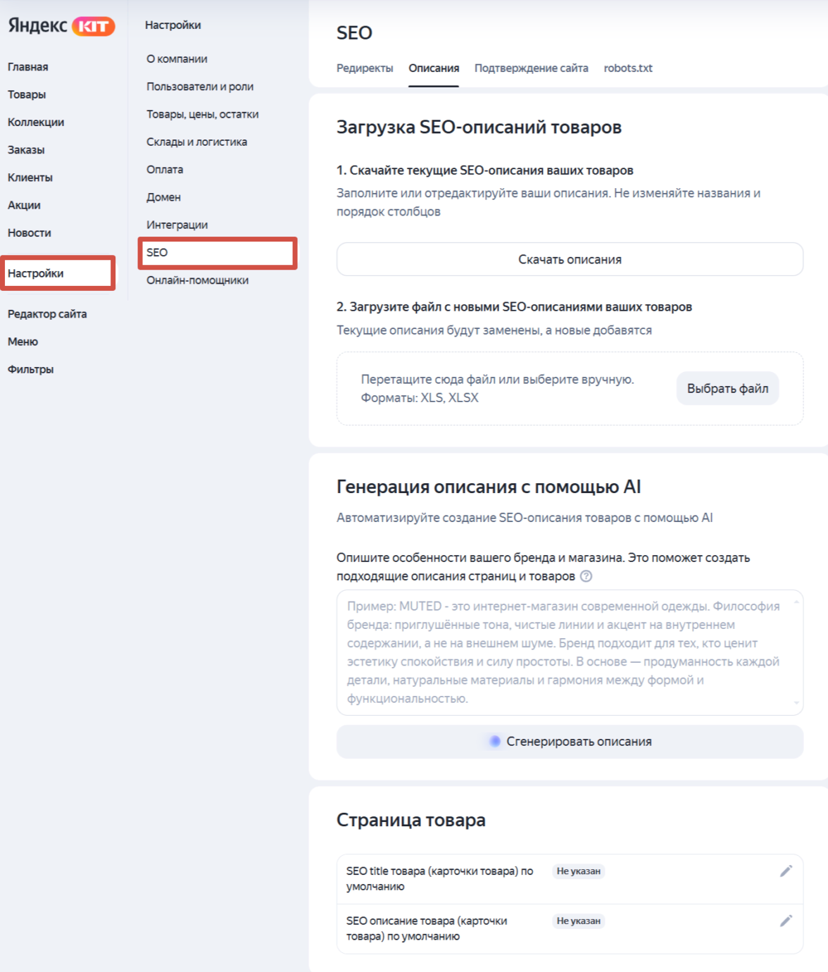 Для ускорения работы доступен AI-генератор описаний — укажите особенности бренда или магазина, и система создаст тексты автоматически. Кроме того, можно вручную задать Title и Description для страниц категорий, коллекций и других статичных разделов сайта.