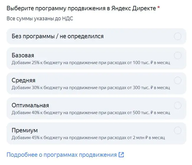 Выберите программу продвижения в Директе. От нее зависят доступные функции платформы и размер бонуса, который Яндекс зачислит на рекламный счет.