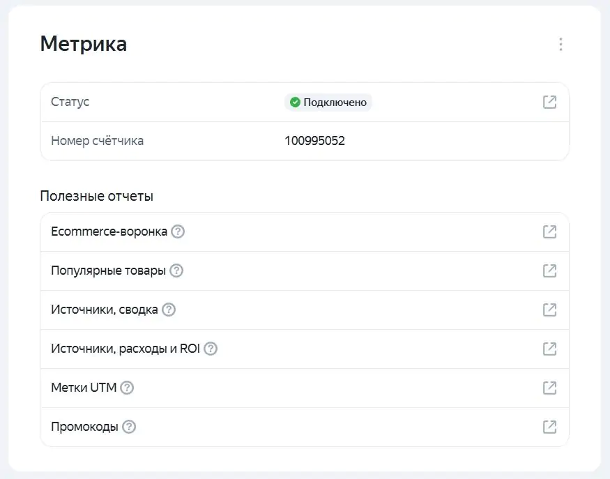 Также по желанию можно подключить RetailCRM, Яндекс Вебмастер и «Товары», чтобы ваши карточки появились в Поиске Яндекса, а сайт получил отметку официального интернет-магазина.