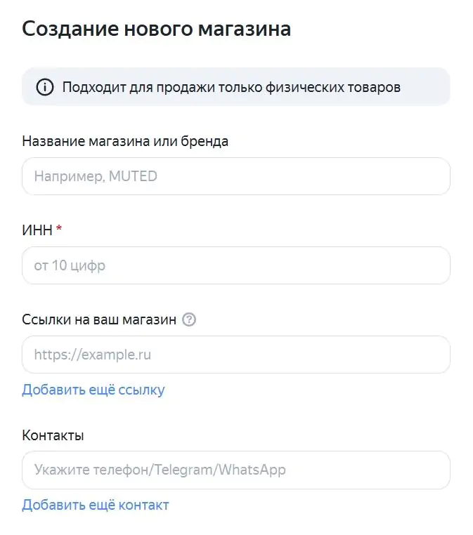 Укажите название магазина или бренда, ИНН, контактные данные. Можно добавить ссылки на страницы магазина на маркетплейсах или на действующий сайт. Допускается несколько ссылок.