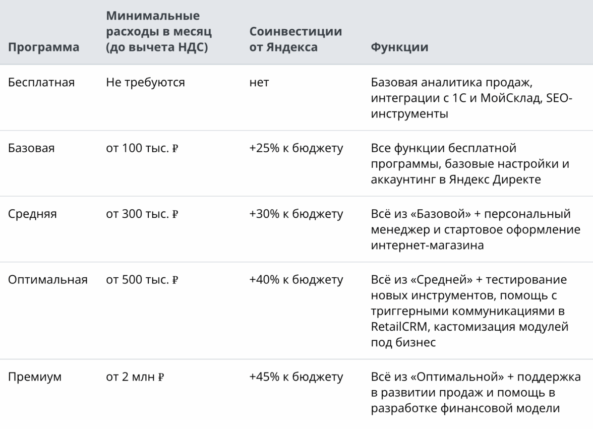 Для компаний, которые продвигают товары в Яндекс Директе, действует программа соинвестирования. Если владелец магазина потратит на рекламу определенный бюджет, Яндекс начислит бонусы на счет в Директе и даст доступ к расширенному функционалу платформы.