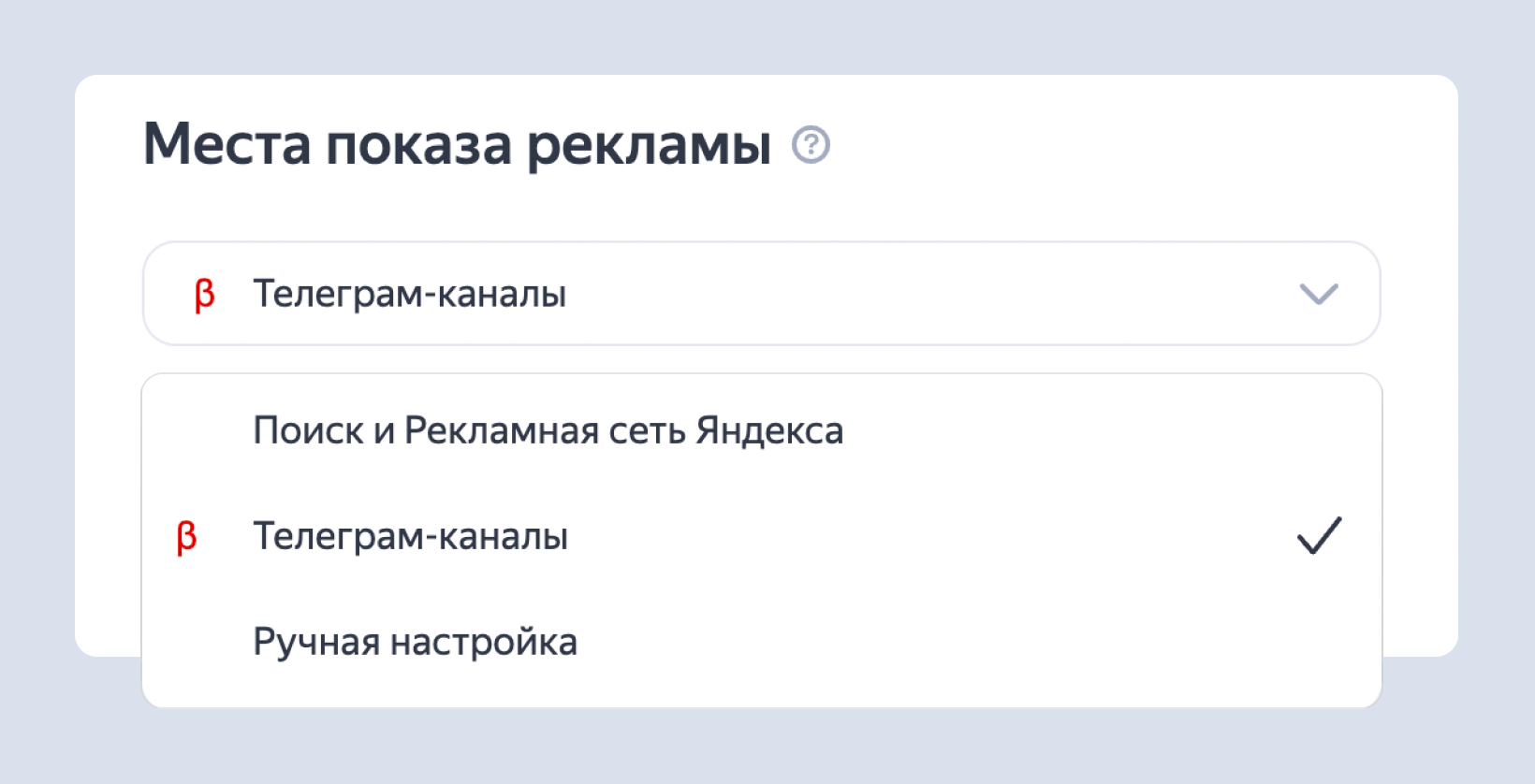 Для того, чтобы создать рекламное объявление для Telegram нужно выбрать в настройках кампании в «Яндекс Директе» место показа «β Телеграм-каналы».