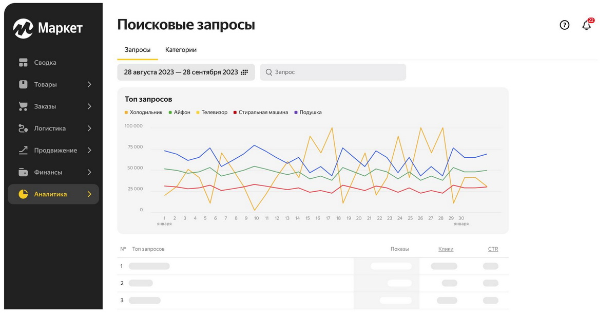 Отчет «Поисковые запросы» находится в кабинете продавца во вкладке «Аналитика» и выполнен в виде графика и таблицы. В таблице собрана расширенная статистика за период: общее количество показов карточек в результатах поиска, число кликов по ним и CTR (процентное соотношение кликов к показам).