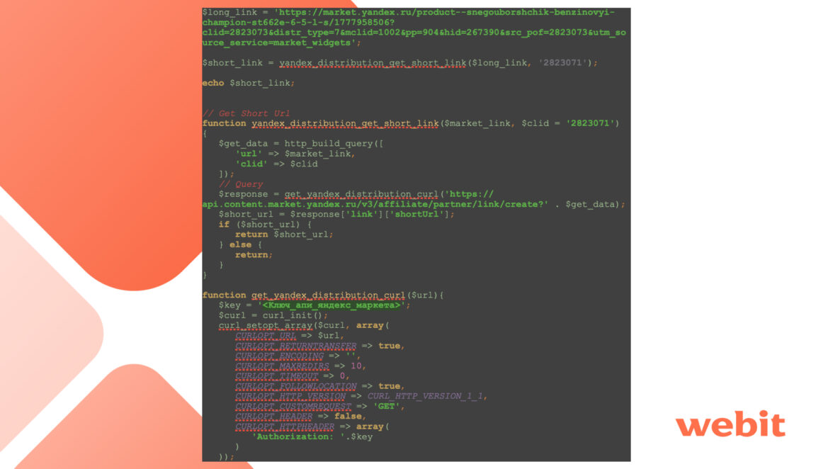 Обратите внимание, в одной из строк нужно указать ключ API, без ключа получить короткую ссылку не получится. Получить ключ можно здесь: https://yandex.ru/support/market-distr/.