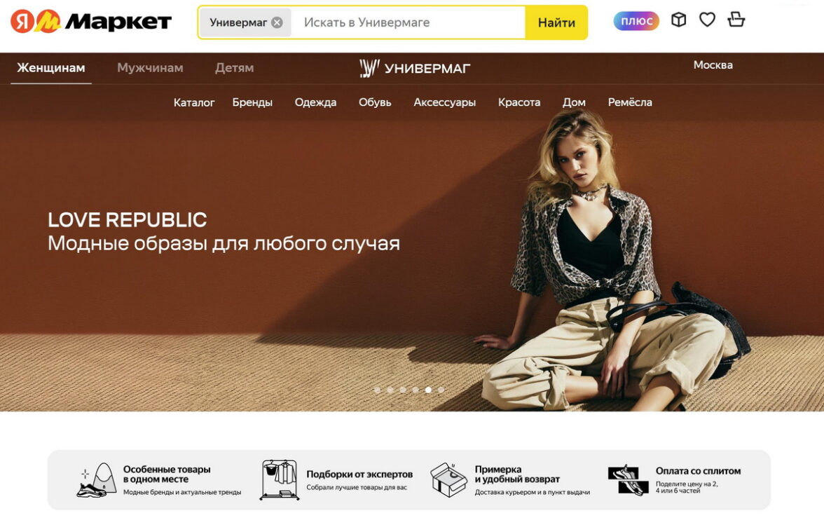 Сейчас этот раздел представляет собой собранные в одном месте товары известных брендов, которые зачастую продаются дороже, чем в обычном «Яндекс Маркете». Подразделы «Универмага» по аналогии с классическим ритейлом называются «корнерами» и разделяются на женский, мужской и детский «уголки». Интересно, что часть российских брендов, перечисленных в списке партнеров «Универмага», уже перестали продвигать свои товары в этом разделе. Это может быть связано с тем, что, согласно условиям размещения, стоимость товаров в «Универмага» должна быть выше 1 тыс. рублей.