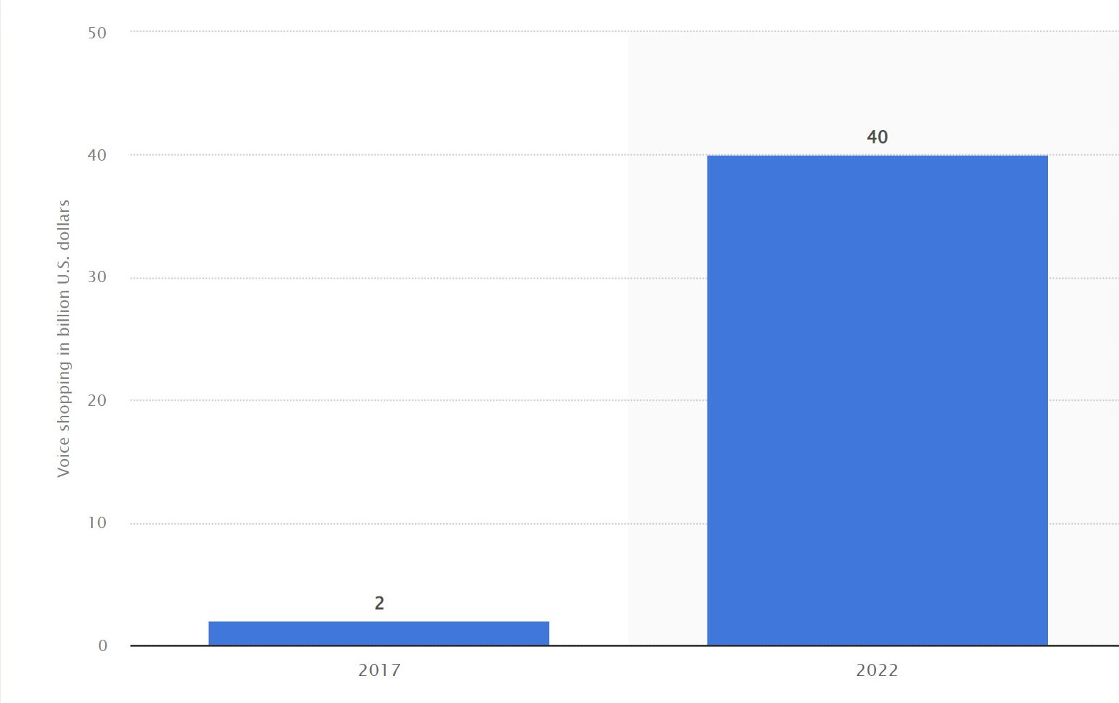 Согласно исследованию сервиса Statista, в мае 2022 года в США 27,4% американских потребителей делают покупки через голосовых помощников, а оборот голосового шоппинга с 2017 года по 2022 год вырос в 20 раз, с $2 млрд до $40 млрд.