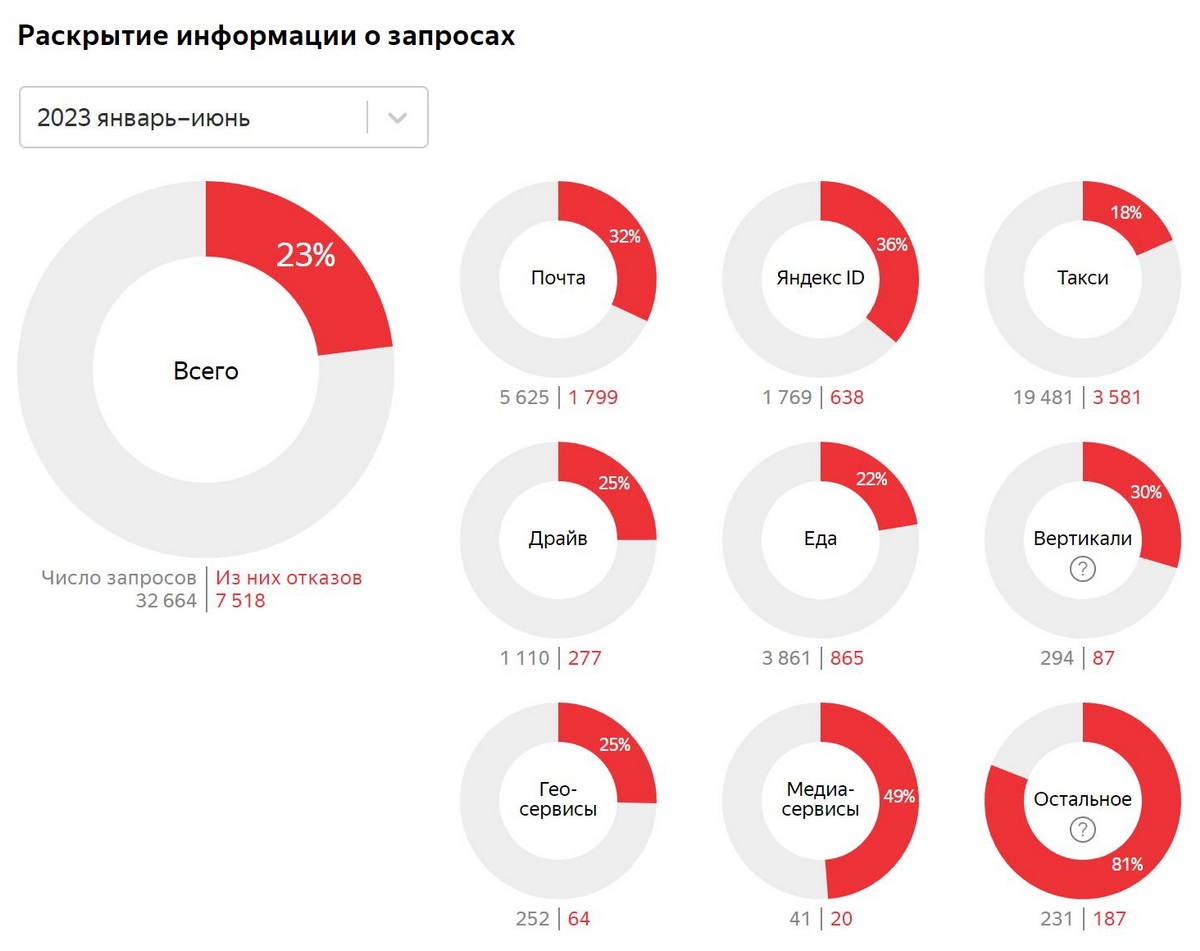 Количество запросов на раскрытие информации растет. С января по июнь 2023 года от госорганов в «Яндекс» поступило 32 664 таких запросов. Это на 47% больше, чем за аналогичный период прошлого года, когда их было 22 110.