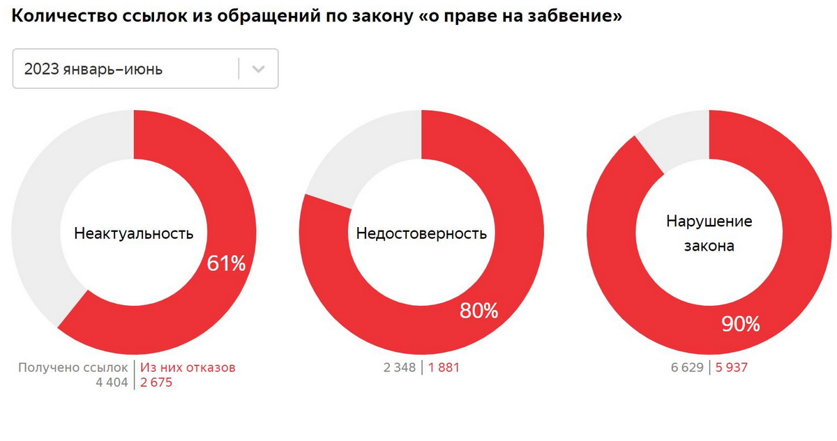 За первое полугодие 2023 года через эту форму в компанию было направлено 13 381 запрос, что на 58% больше, чем за аналогичный период прошлого года, когда подобных просьб поступило 8426. 77% из них остались без удовлетворения: из 4404 запросов на удаление неактуальных ссылок отказано было в 61% случаях, из 2384 недостоверных – 80%, из 6629 нарушающих закон – 90%.
