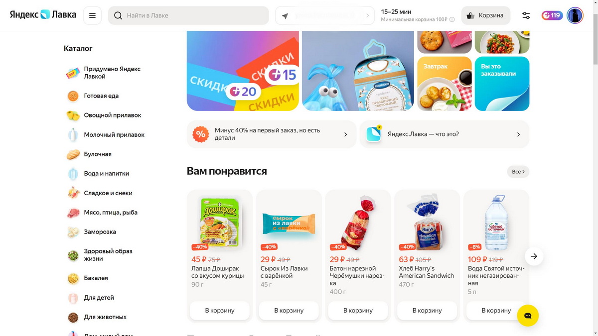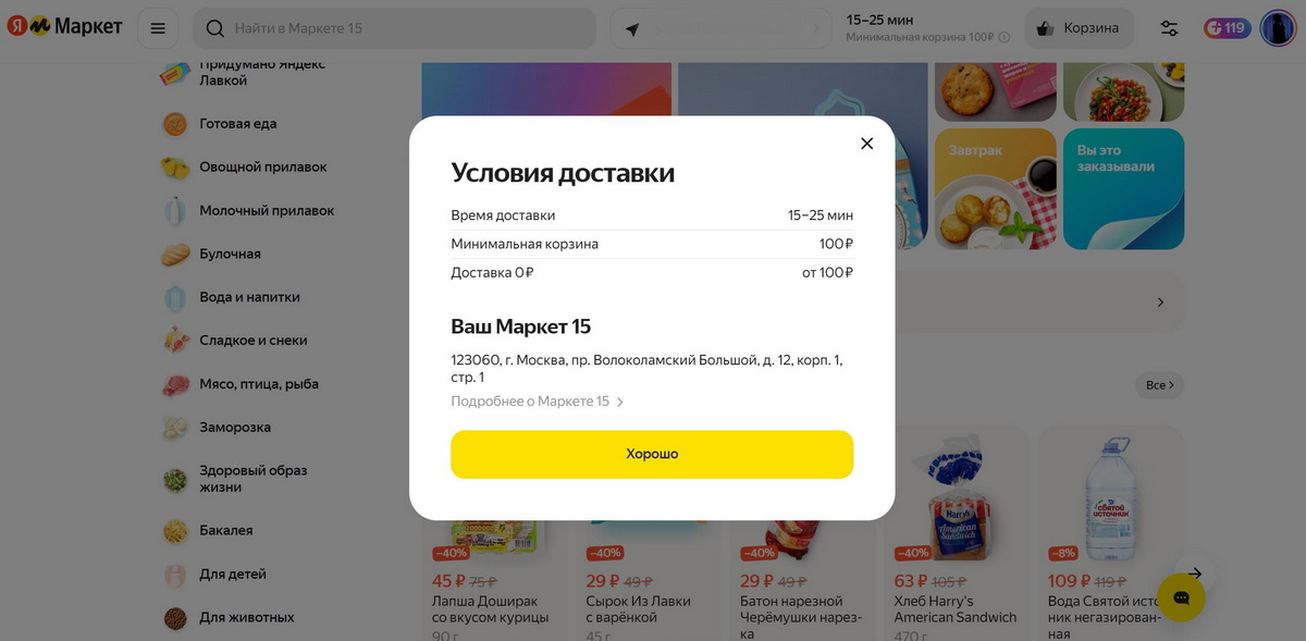 Неудивительно, что новичок эконом-класса использует тот же склад, что и его старший брат. Заодно «Маркету 15» достался и дизайн «Яндекс.Лавки»: страницы сервисов отличаются только логотипом.