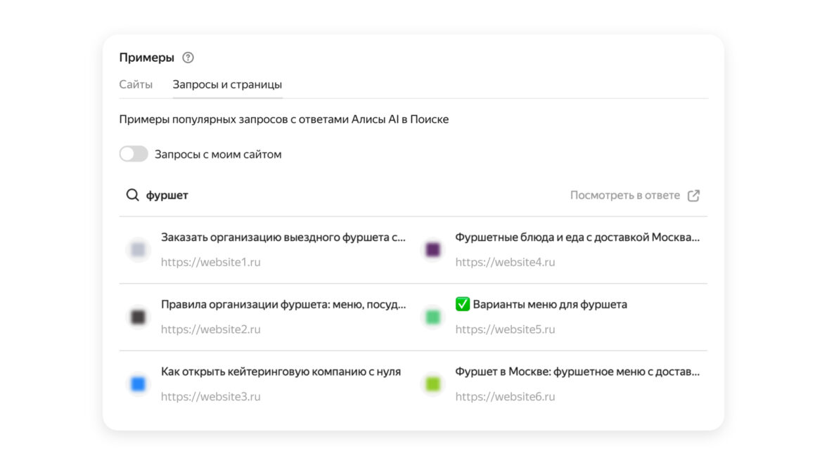 Инструмент позволяет увидеть сайты, которые вместе с вашим упоминаются в ответах «Алисы AI».