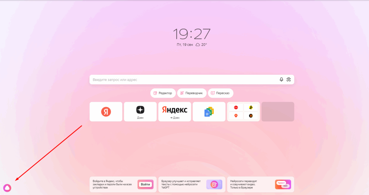 В нижнем углу Яндекс Браузера найдите фиолетовый круглый значок с белым узором — это встроенный доступ к YandexGPT. Нажмите на него, чтобы начать диалог без перехода на другие страницы.