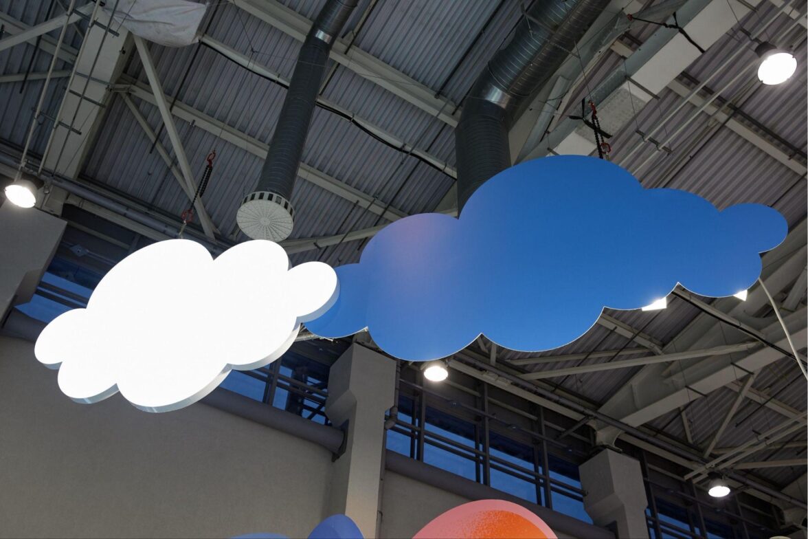 Подвес был у многих регионов. Это небольшая, но очень важная деталь, которая добавляет объем стенду и делает его заметным со всех углов выставки. Клиент очень хотел сделать подвес, однако, это было сложно реализовать по техническим особенностям проектирования выставки. К дню региона мы нашли решение, как сделать подвес на столь небольшом допустимом участке, — подвесить пару облаков, которым не требовалось много места для крепления.