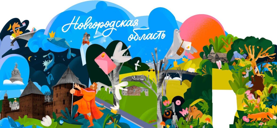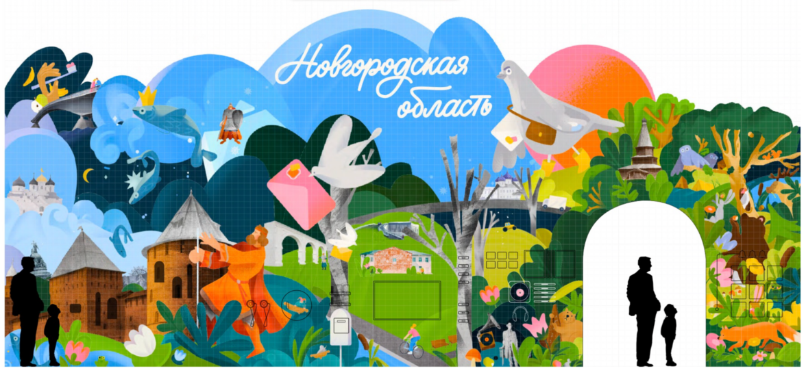 Начали с глубокого исследования, чем гордится регион, какие смыслы он хранит. Однако на новгородской земле сосредоточено такое количество символов и смыслов, что их не получилось уместить в один дизайн-макет. Тогда мы пришли к заказчику с идеей: создать красочный монументальный коллаж из сотни ярких образов.