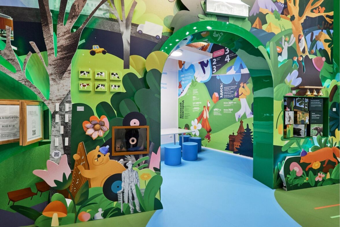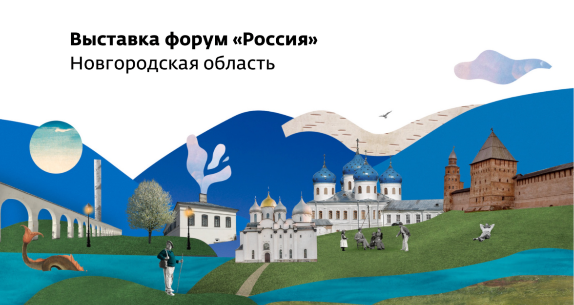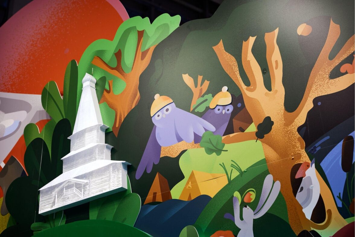 Мы понимали, что у Новгородской области очень много образов и символов. Но так как площадь стенда была невелика, — всего 84 кв. м, — и внимание гостя длилось не более 10 минут, выбрали около 30 самых ярких образов региона. А затем иллюстратор объединил их на красочной «картине региона».