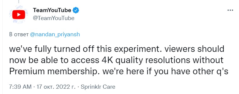 Спустя две недели видеохостинг официально завершил эксперимент, о чем также уведомил твитом.