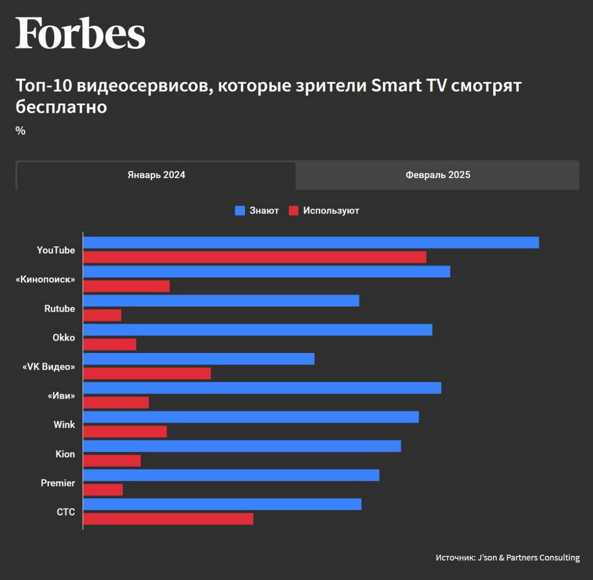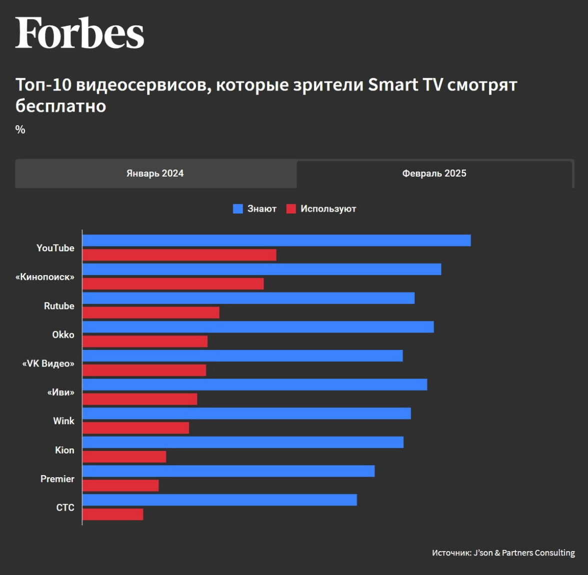 Во второй половине 2024 года рынок приложений для Smart TV претерпел «тектонические изменения», пишет Forbes со ссылкой на отчет аналитического агентства J’son & Partners Consulting. Исследование, проведенное в феврале 2025 года, показало, что лишь 36% владельцев Smart TV продолжают использовать YouTube для просмотра бесплатного видеоконтента, хотя годом ранее этот показатель достигал 63,2%. При этом, несмотря на снижение популярности, YouTube остается лидером среди бесплатных видеосервисов на платформе Smart TV.