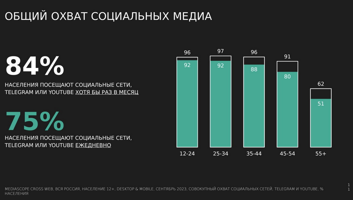 Из данных Mediascope следует, что 84% населения России посещают соцсети, Telegram или YouTube хотя бы раз в месяц, а 75% делают это ежедневно. Интерес к соцмедиа соотносится с возрастом: чем старше пользователь интернета, тем меньше времени он проводит в соцсетях. Так, более 80% россиян 12-54 лет заходят на социальные платформы ежедневно и более 90% – хотя бы раз в месяц. В возрастной группе старше 55 лет заметен резкий спад интереса к соцмедиа, но показатель все равно превышает 50% (62% заходят в соцсети ежемесячно, 51% – ежедневно).