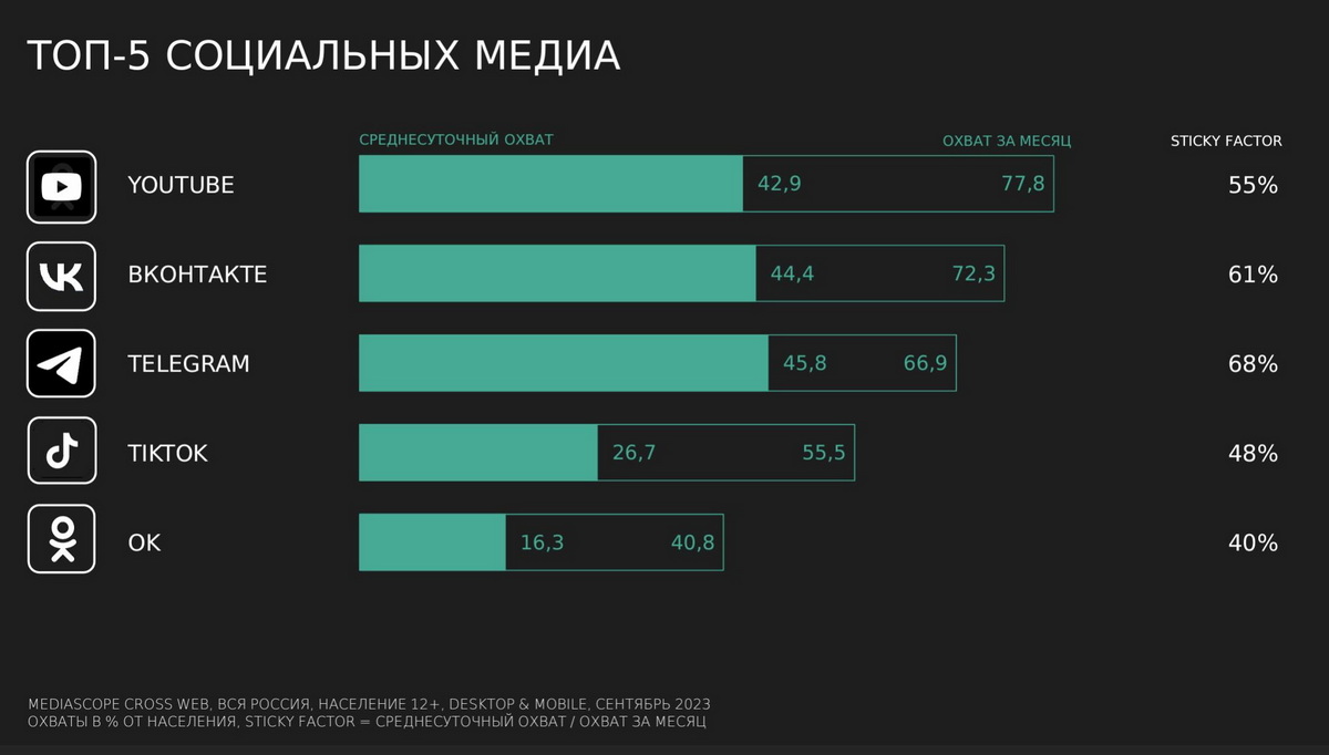 Показатели YouTube в России немного ниже, чем в США, но это не мешает видеопорталу занимать первое место. По данным исследовательской компании Mediascope, в сентябре 2023-го YouTube лидировал по ежемесячному охвату в России: ролики и трансляции на видеохостинге Google хотя бы раз в месяц смотрели 77,8% россиян, а ежедневно – 42,9%. Второе место контролирует соцсеть «ВКонтакте»: ее среднемесячный охват составил 72,3%, среднесуточный – 44,4%. Тройку лидеров замыкает мессенджер-соцсеть Telegram – 66,9% и 45,8% соответственно. Ушедшая китайская платформа коротких вертикальных роликов TikTok расположилась на четвертой строке (55,5% и 26,7%). Замыкает пятерку соцсеть-пенсионер «Одноклассники», куда каждый месяц заходят 40,8% российских пользователей интернета, а каждый день – 16,3%.