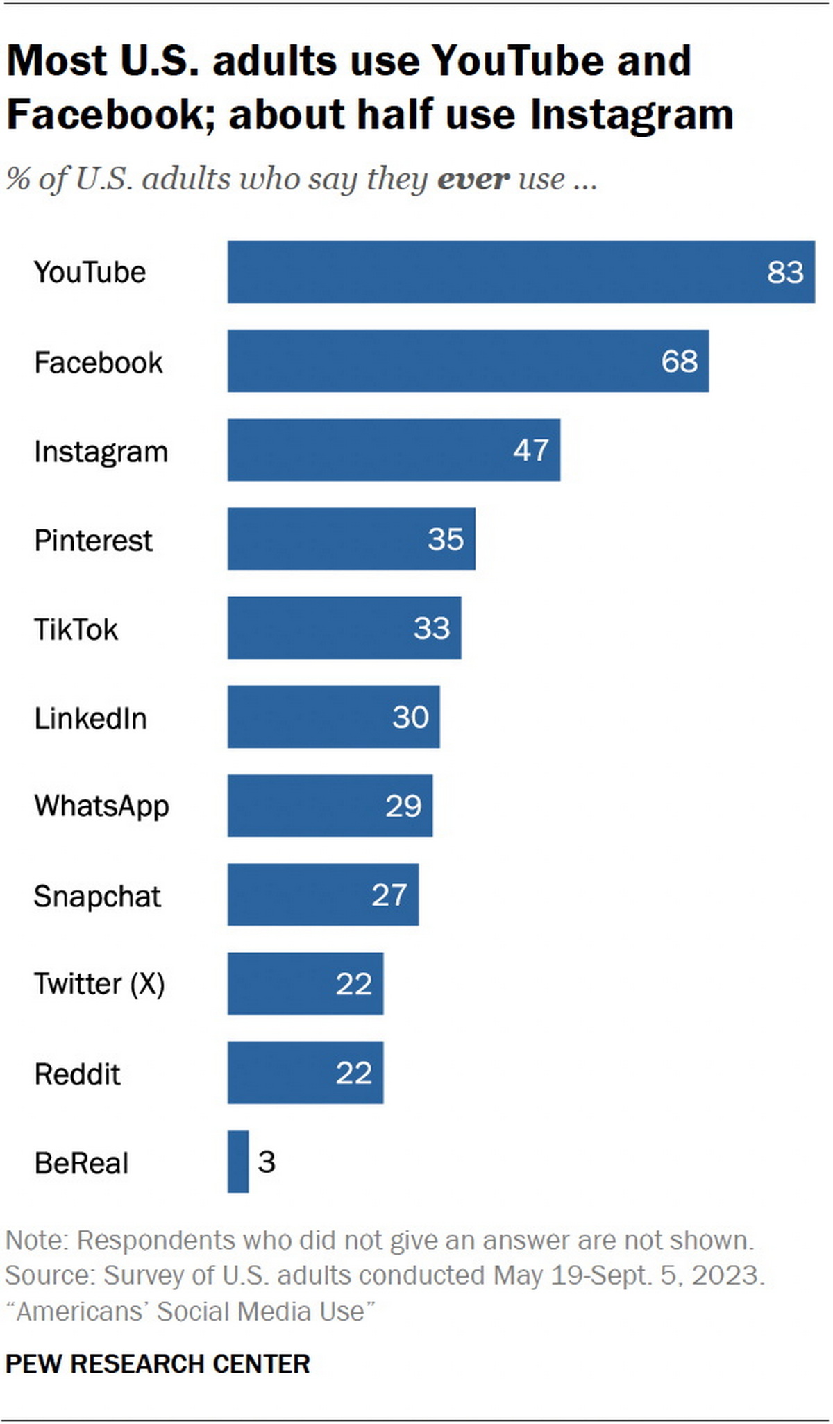 Американская негосударственная социологическая компания The Pew Research Center провела опрос, чтобы выяснить какие соцмедиа американцы посещают чаще всего и проследить изменения аудитории этих ресурсов. В исследовании, проходившим в США с 19 мая по 5 сентября 2023 года, приняли участие 5733 респондентов старше 18 лет.
