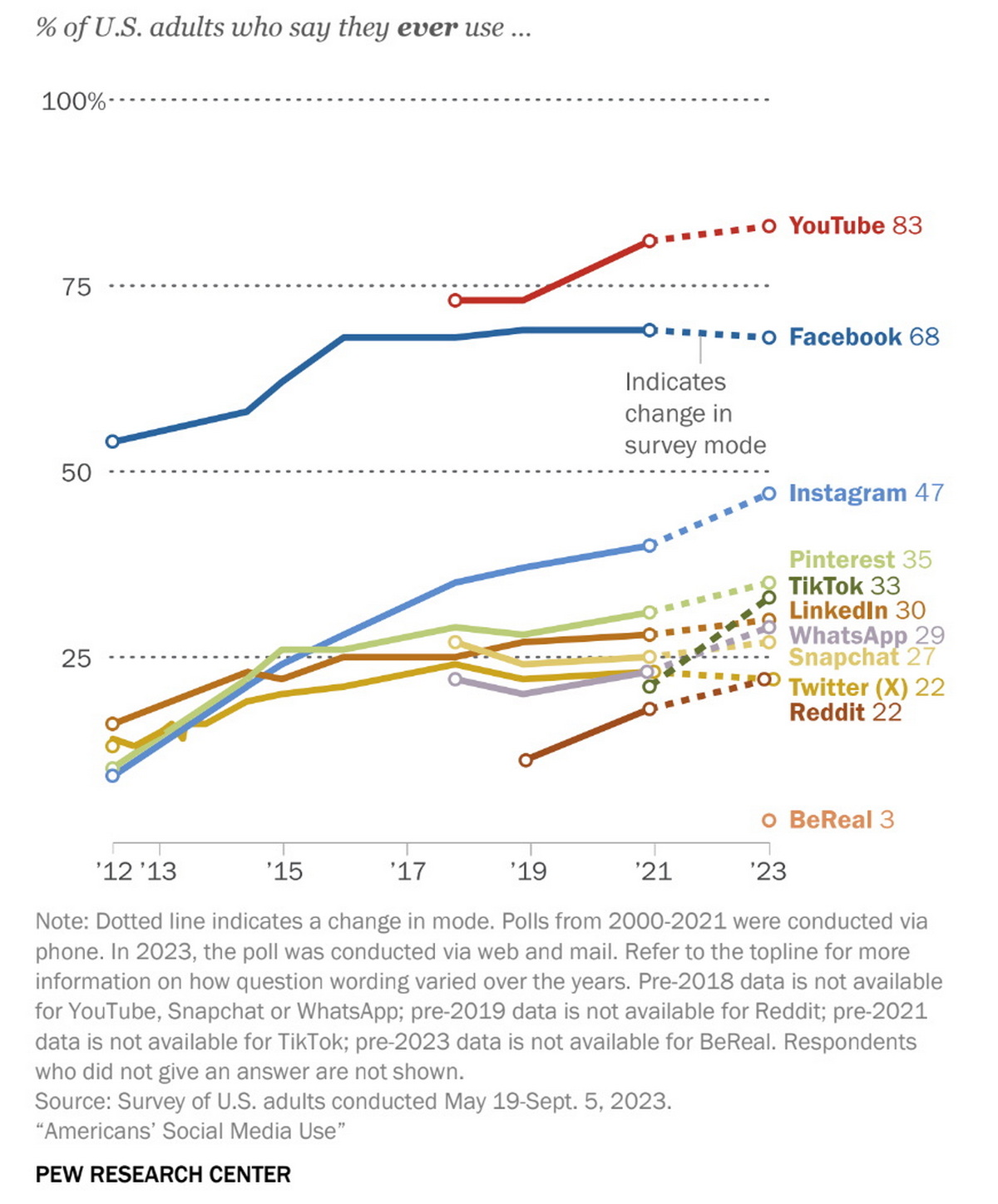 В Pew Research констатировали, что аудитория ключевых соцсетей в США в последние два года стабильна. Так, хотя YouTube и Facebook доминируют в сегменте, но доля участников опроса, использующих эти платформы, не меняется с 2021 года.
