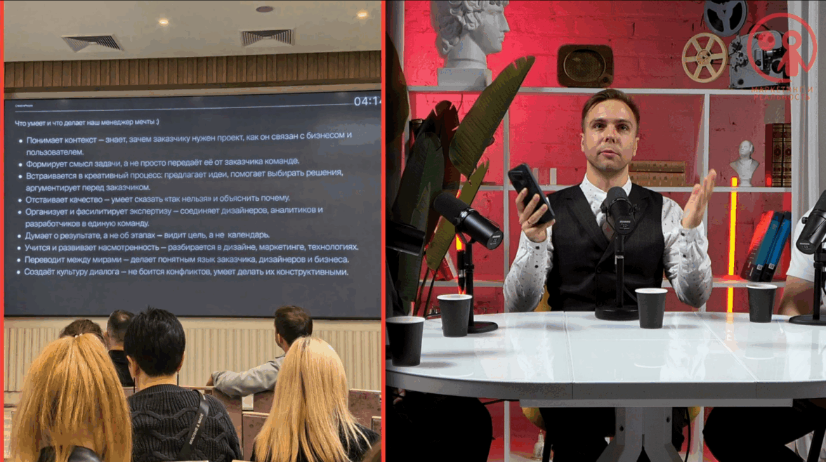 Александр Дяченко: Сергей, тема твоей лекции: ”Как делать дизайн на заказ круто: про управление проектами и подрядчиками». Основная часть твоей лекции сводилась к тем, кто управляет внутри. Также ты упоминал про «идеального менеджера».