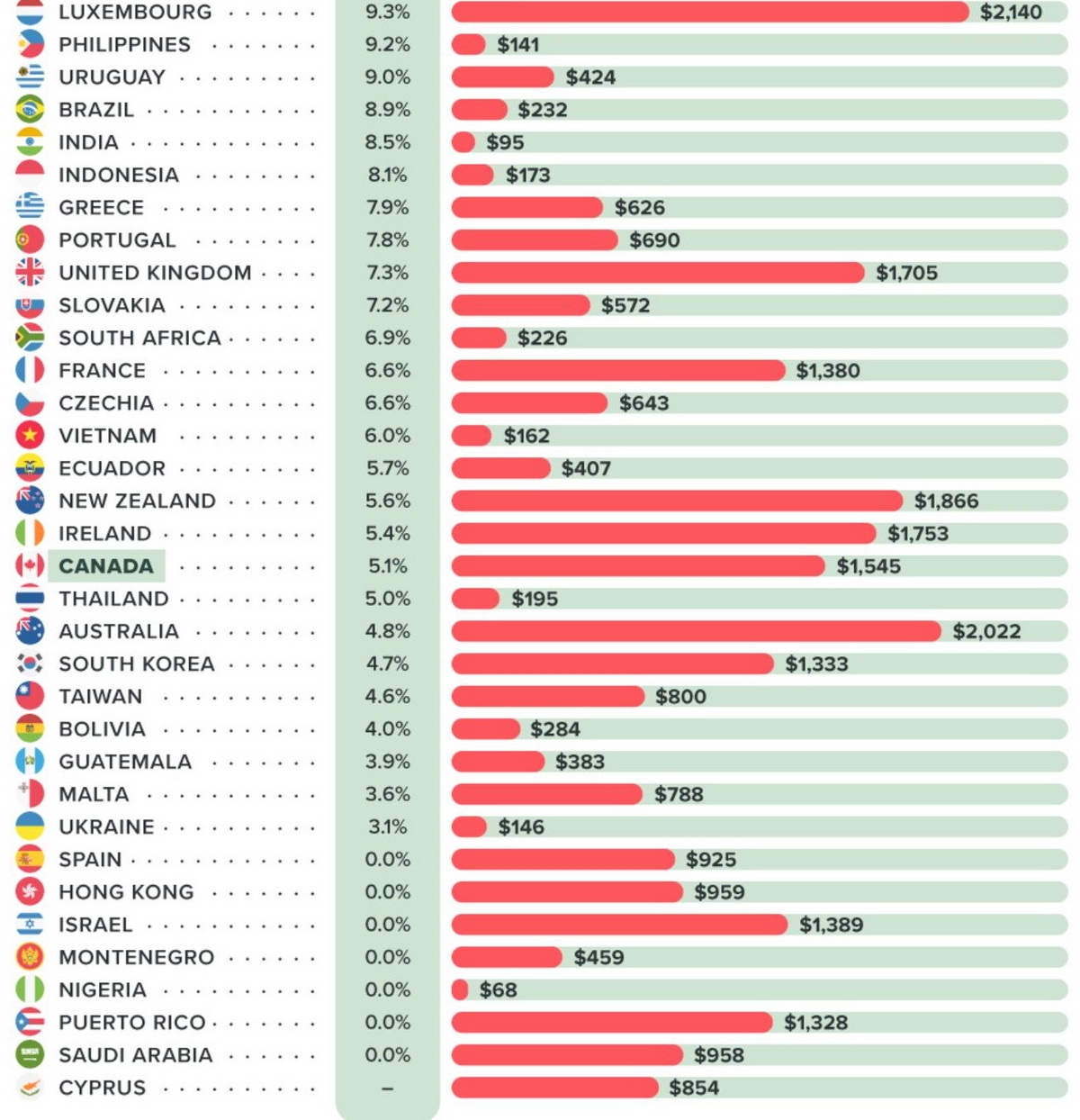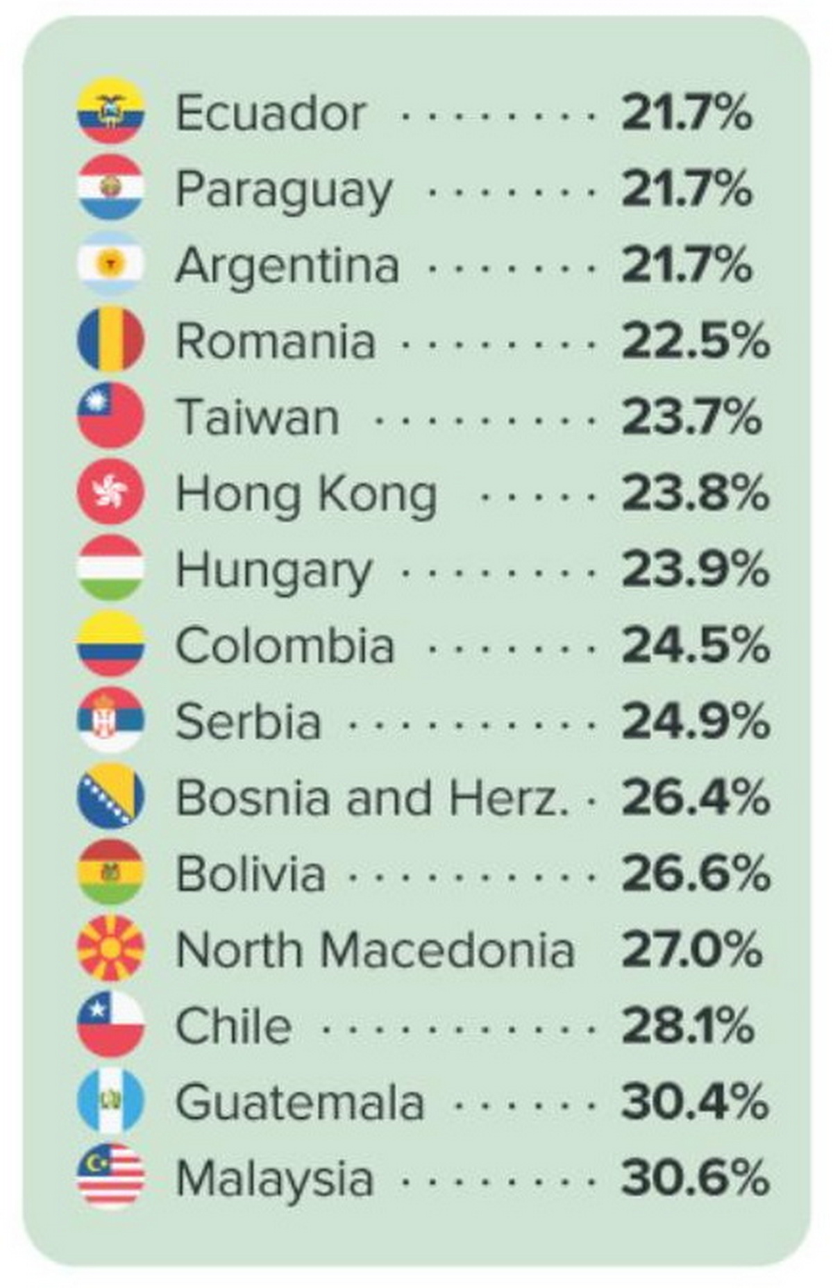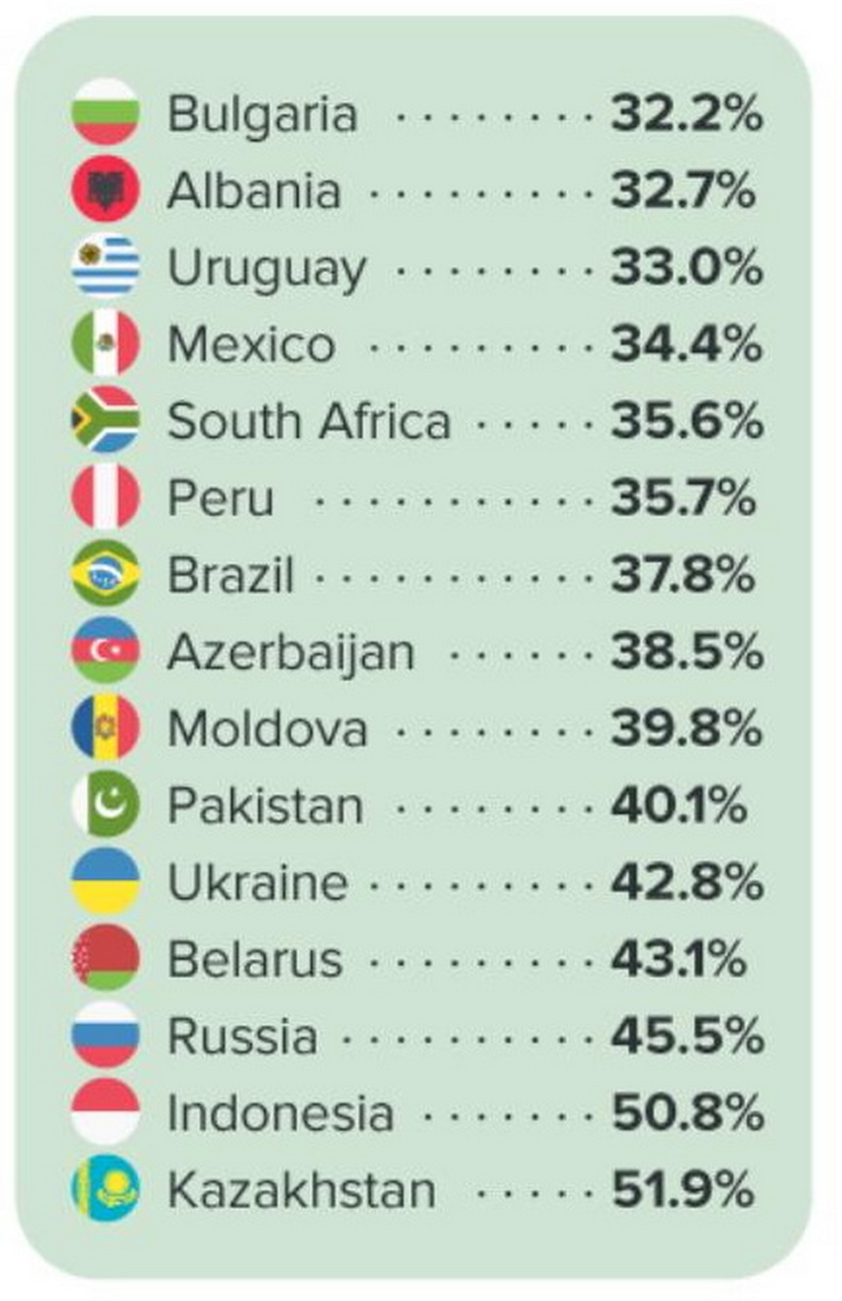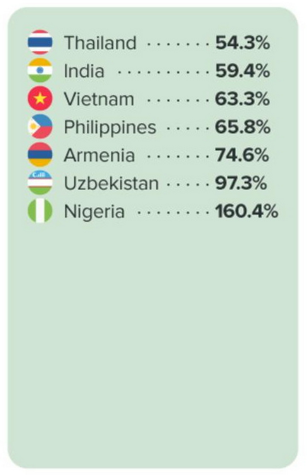 Лидерами антирейтинга стали Армения, Узбекистан и Нигерия — армянин отдаст за еду 74,6% минимального заработка, узбек — 97,3%, нигериец — 160,4%.