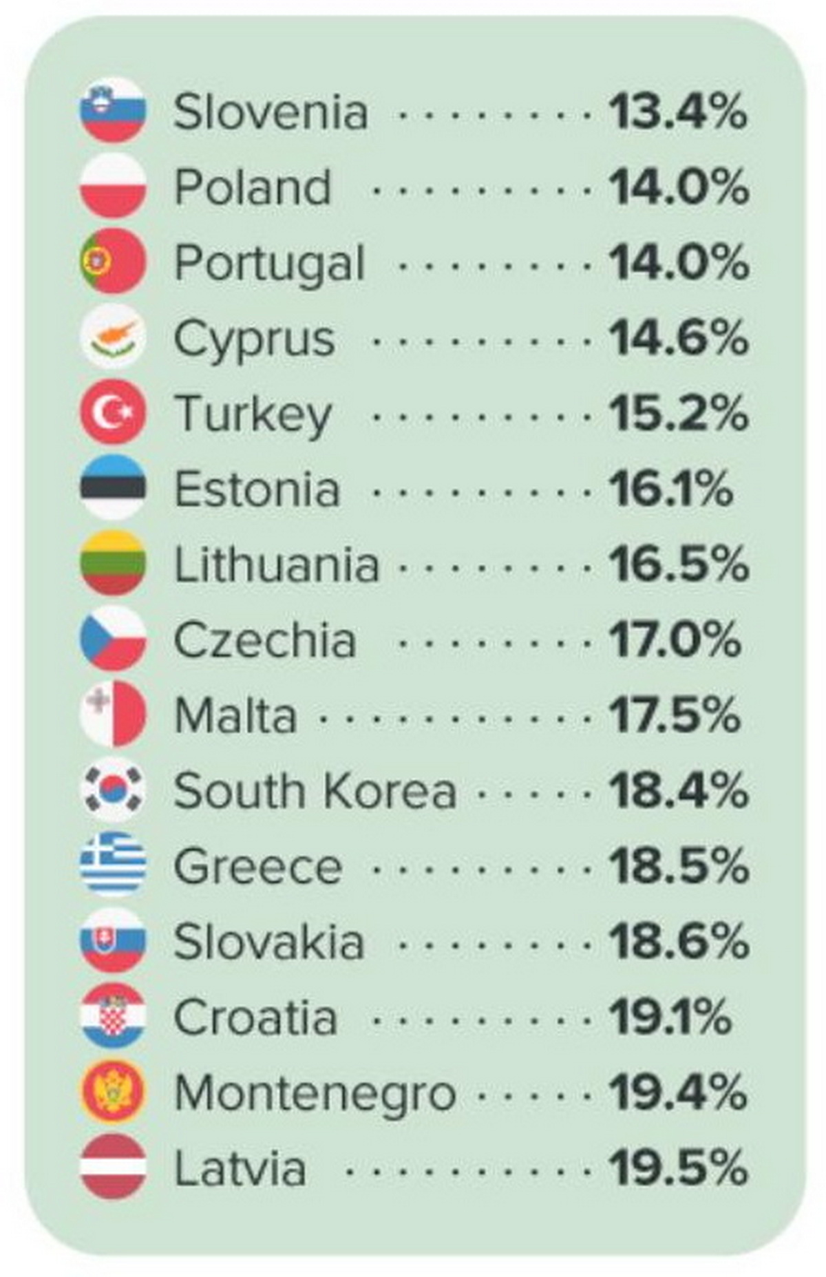 Страны, которые также выделяются высоким ростом минимальной заработной платы, — это Молдавия (рост в годовом исчислении на 32,5%), Латвия (27,1%) и Малайзия (25,8%).