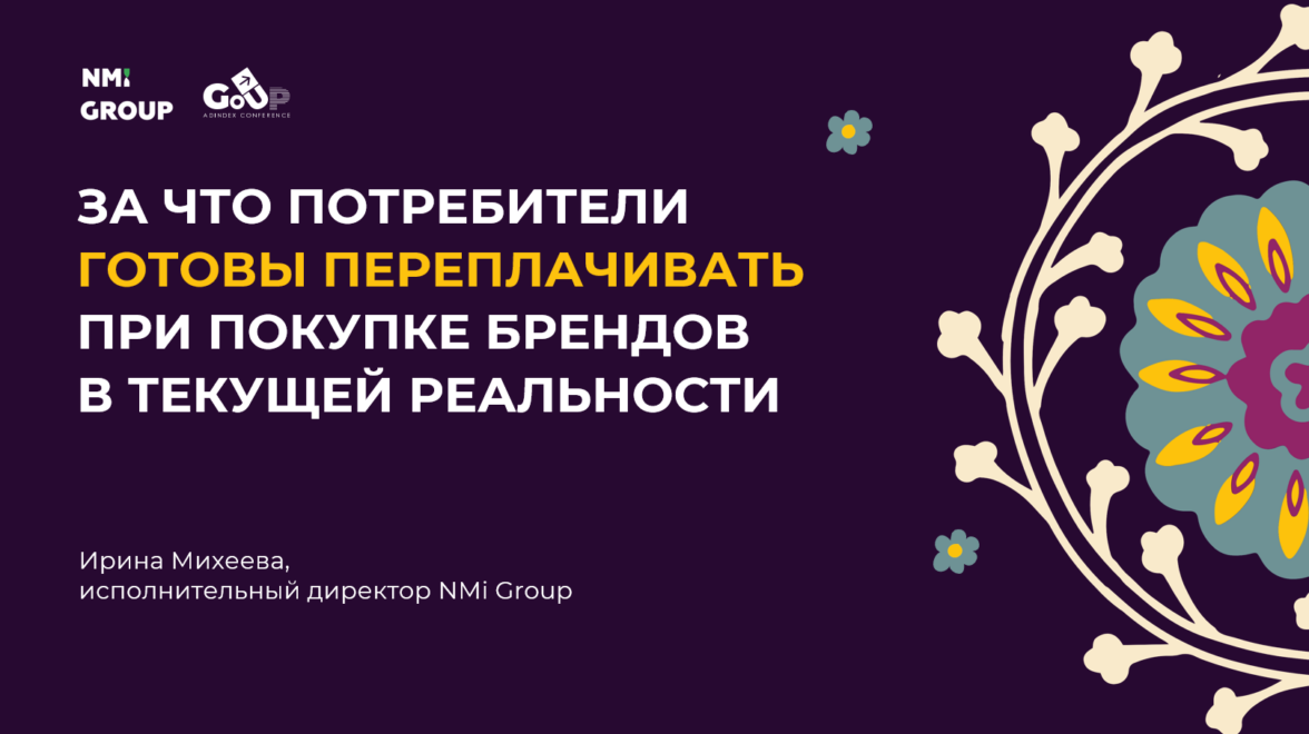 Открыла секцию Ирина Михеева, исполнительный директор NMi Group. Она представила исследование «За что потребители готовы переплачивать при покупке брендов в текущей реальности».