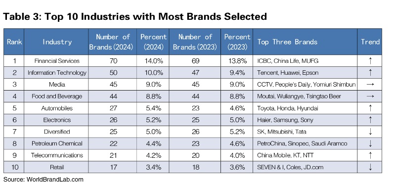 Как отмечают составители рейтинга, по сравнению с прошлым годом увеличилось число брендов, принадлежащих компаниям, действующим в таких отраслях как финансы, информационные технологии, автомобилестроение, электроника и телекоммуникации. В то же время уменьшилось число брендов, представляющих такие отрасли, как нефтехимия, производство строительных материалов и услуги авиаперевозок. В этом году в рейтинг 500 самых влиятельных брендов Азии вошли бренды из 41 отрасли. Сильнее всего представлен финансовый сектор — 70 брендов. На втором месте — бренды ИТ-компаний, их 50. На третьем — бренды медиакомпаний (45). В первую десятку вошли также представители следующих отраслей (в порядке убывания, в скобках указано число брендов): продукты питания и напитки (44), автомобилестроение (27), электроника (26), многопрофильные конгломераты (25), нефтехимия (22), телекоммуникации (21), розничная торговля (17).По оценке аналитиков World Brand Lab, технологические бренды в азиатских странах, как правило, слабее, чем в США, в то время как люксовые бренды в Азии отстают от европейских.
