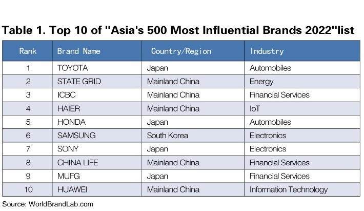Самым-самым влиятельным в Азии был признан бренд японского автомобилестроительного концерна Toyota. Вторым по влиятельности — бренд Государственной электросетевой корпорации Китая (State Grid), крупнейшей в мире в своей отрасли. Третье место — у бренда Промышленно-торгового банка Китая (Industrial and Commercial Bank of China, ICBC) — крупнейшего коммерческого банка Китая и мира.